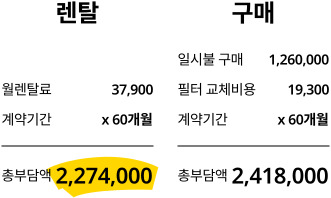 조건에 따라 구매보다 렌탈의 총 이용료(이후 소유)가 더 합리적인 경우가 있기 때문에 꼭 필요하신 가전의 최저가와 렌탈 총 비용을 비교해보시는 것을 권장 드립니다.